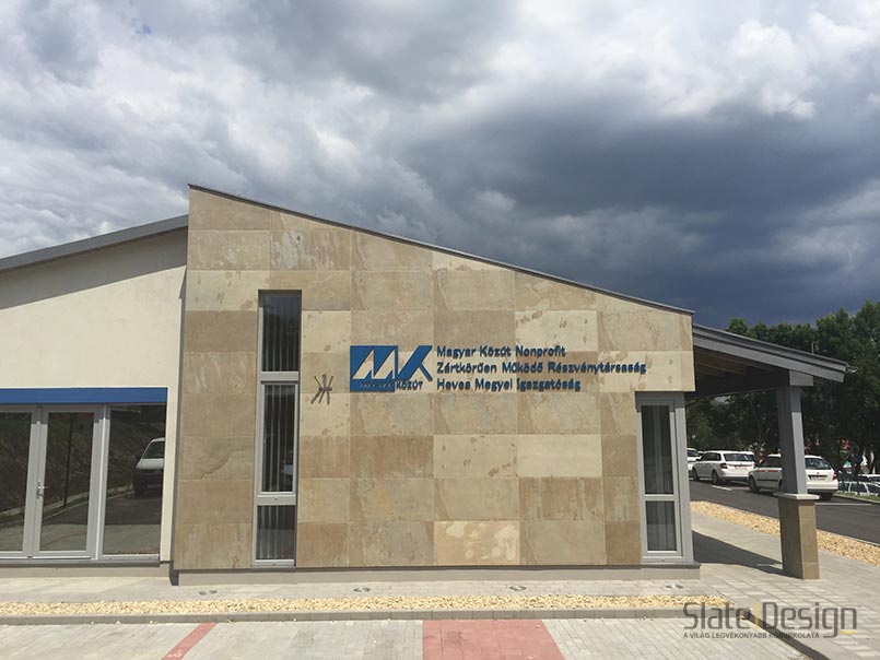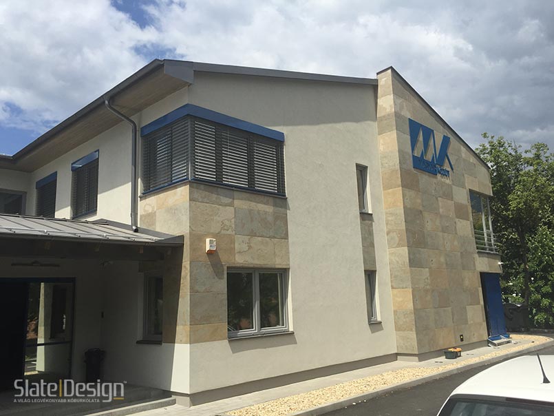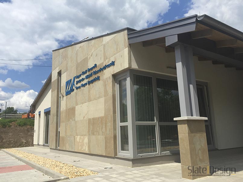 A közel 500 m2-es alapterületű, két szintes épület homlokzatának több pontját ultravékony Slate Design LiteStone kőfurnér burkolatok díszítik. A bézs árnyalatú, Tan névre hallgató, mindössze 2 mm vékony burkolatok 122×61 cm-es táblaméretben kerültek felragasztásra a megfelelően előkészített szigetelt homlokzatra.