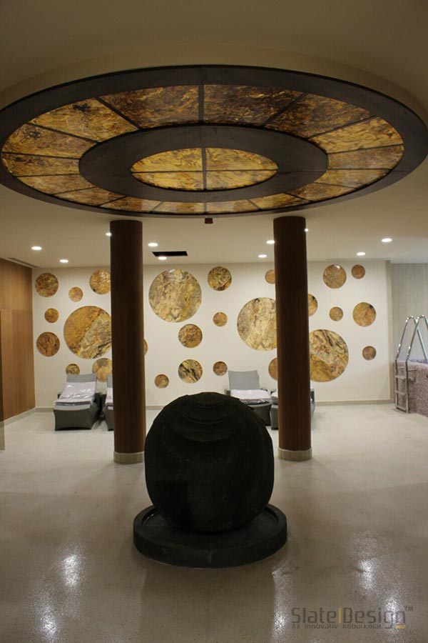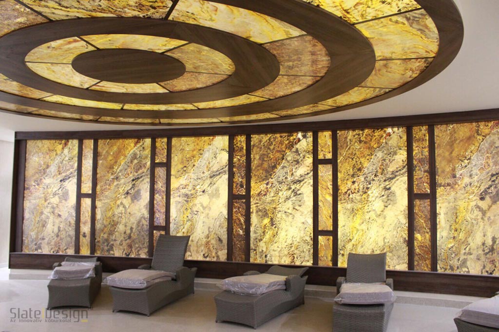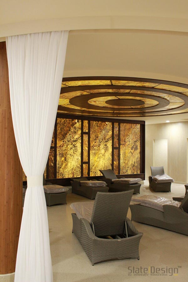 Az egyik leglátványosabb felületet a Relax teremben lehet megfigyelni, ahol is az átvilágítható Translucent termékcsalád Indian Autumn textúráját építették be, mely a precízen beállított háttérmegvilágításnak köszönhetően üde színfoltja lett a komplexumnak. Itt a normál táblaméret mellett az áttetsző kőfurnér burkolatokat extrém nagy, vagyis 2440×1220 mm-es méretben is felhasználták.