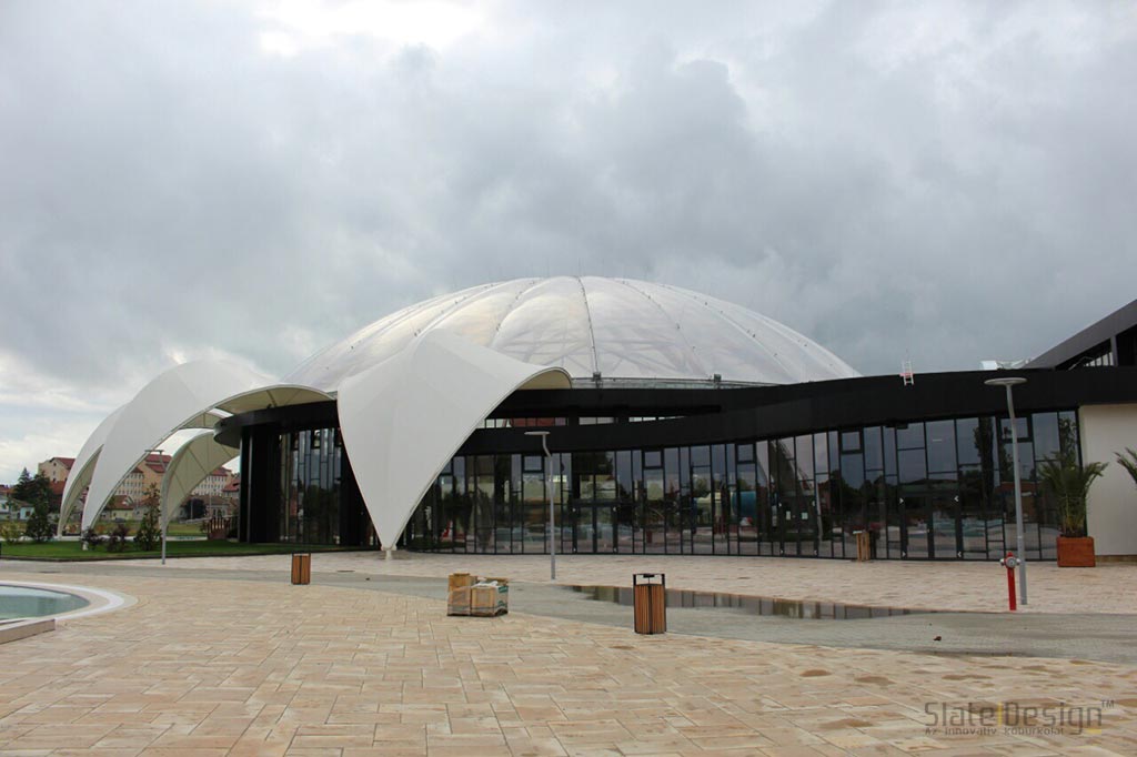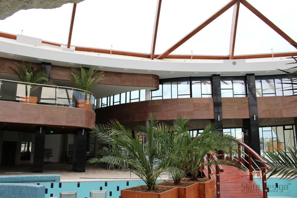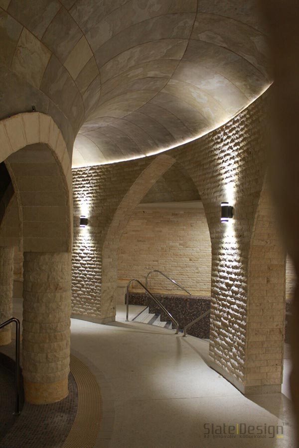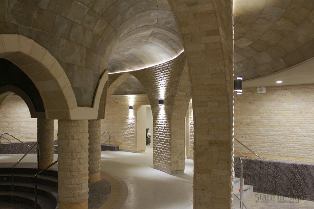 „A nagyváradi Nymphaea Wellness és Élményközpont megvalósítása során merült fel az az igény, hogy egy olyan termálvizes medence készüljön, mely hitelesen adja vissza egy törökfürdő hangulatát. A látványterveken megjelenített boltíves közlekedő, és a medencetér feletti kupola megvalósításához ideális választás volt a Slate Design Kft. által forgalmazott kőfurnér burkolat alkalmazása. Az alkalmazott lapokkal le lehetett követni a mindkét irányban ívelt felületeket, és nem csak esztétikus burkolatkiosztást tudtuk megvalósítani, de jó költséghatékonysággal, hiteles törökfürdő hatást tudtunk elérni” – mondta el Szalay Zsolt, a KÉSZ Zrt. belsőépítész főmérnöke a munkálatok befejeztével.