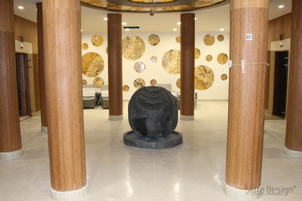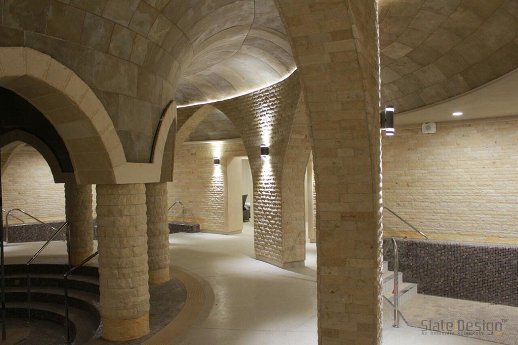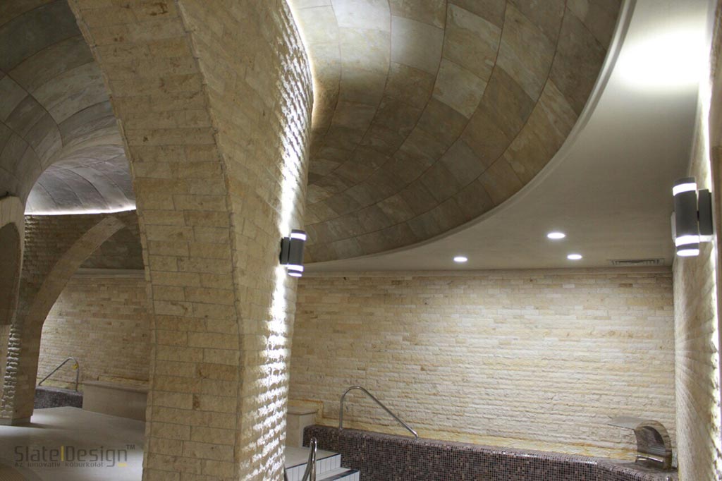 A Rudas fürdő ihlette törökfürdőnek a kialakításánál a kupola, valamint az egyéb íves felületek burkolása során a cél a mészkő hatás elérése volt biztonságos módon. Itt a Tan struktúrájú, mindössze 2-3 mm-es, ultravékony agyagpala lapokat használták fel.