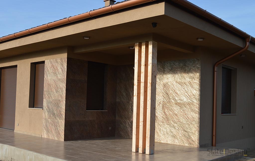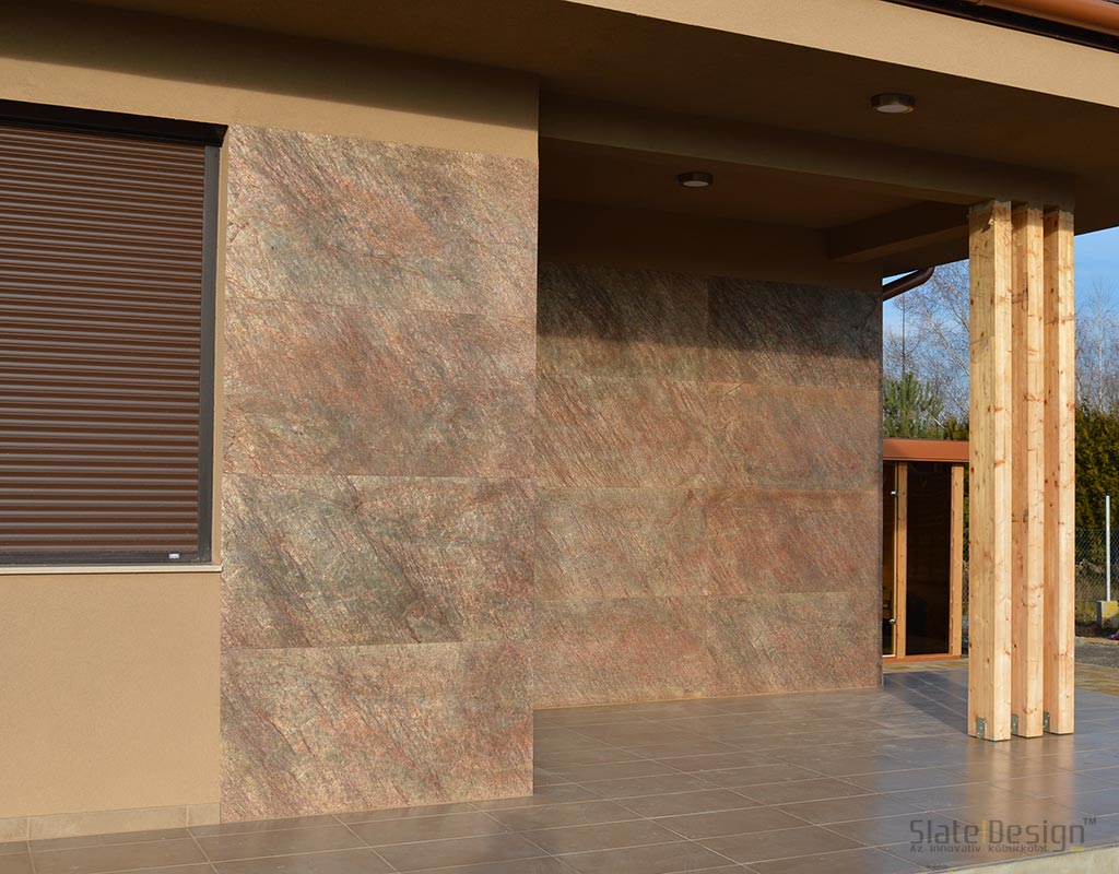 Szadai ügyfelünk 2017-ben épült családi házának teraszára a cappuccino falszínnel rendkívül jól harmonizáló Copper struktúrát választotta, melynek így ez volt a magyarországi debütálása homlokzati felhasználásként! Partnereink kültéren többnyire valamely matt felületű agyagpala alkalmazása mellett döntenek, de az a sejtésünk, hogy a Copper lapokon megcsillanó felkelő nap fénye másokat is elcsábít majd a csillámpalák felé!