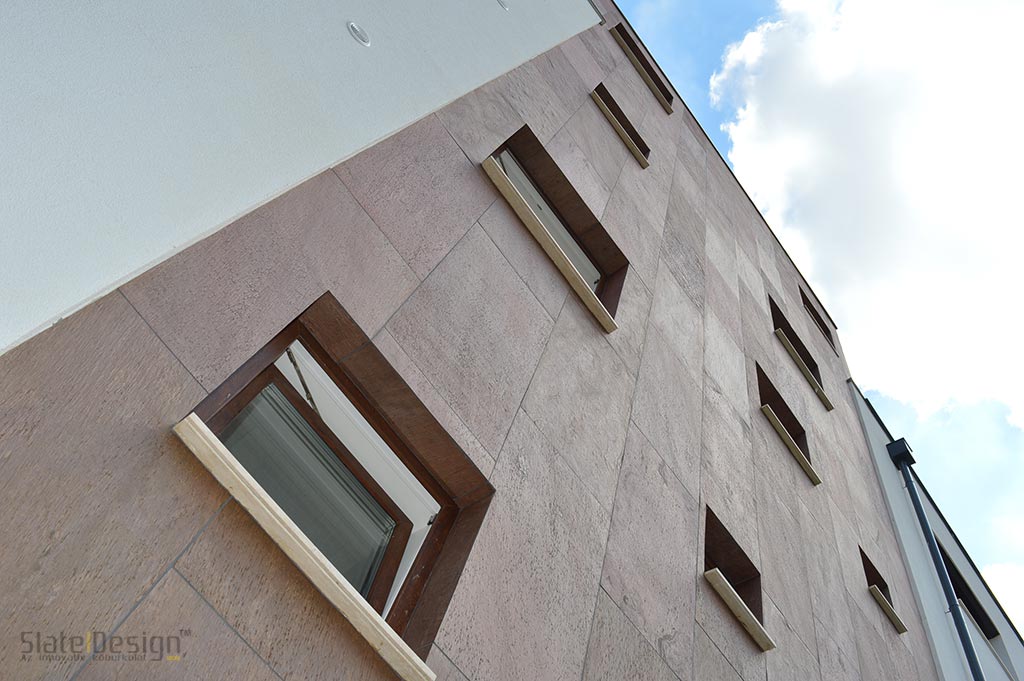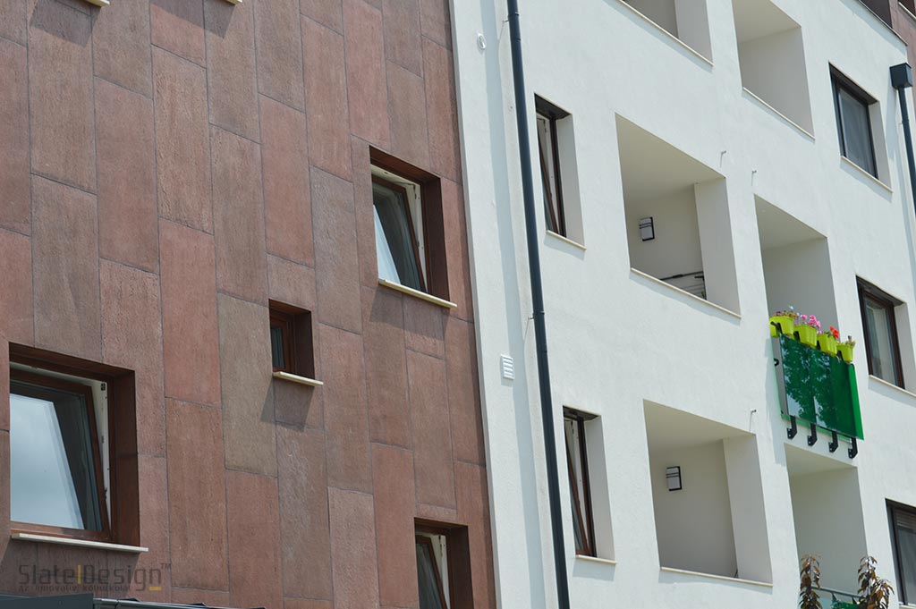 A kb. 2 mm vékony, mindössze 1,5-1,7 kg/m2 súlyú csillámpala kőfurnér lapok felhelyezése is meglehetősen rövid idő alatt történt – szemben a hagyományos, vastag, szerelt kőburkolati megoldásokkal. A 1220×610 mm-es lapokat kétkomponensű epoxy ragasztóval rögzítették a hőszigetelt homlokzatra.